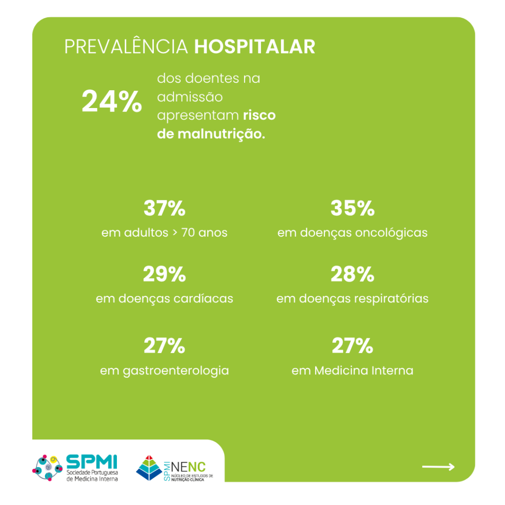 Em Portugal, a prevalência de risco nutricional em adultos internados nos hospitais atinge cerca de 28% a 42%, sendo que pode ser ainda mais elevado em especialidades de risco, com as enfermarias de Medicina Interna (chegando a 51%), com fatores como admissões prévias e comorbilidades múltiplas a aumentarem o risco.
